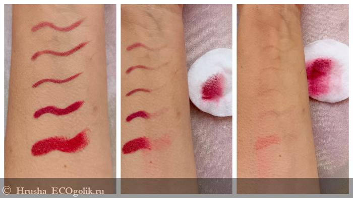 На фото посмотрим на руке, а в жизни я снимала пару раз и темную помаду, но чаще карандаши, которые я наношу или контуром, или поверх всех губ.