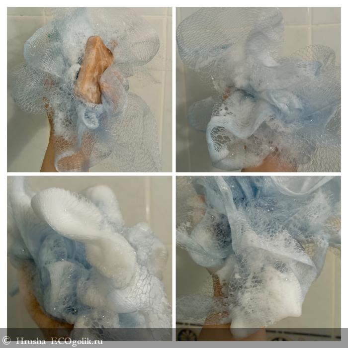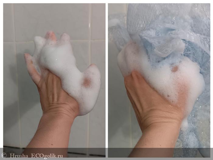 На мочалке-губке пенка еще более плотная и кремовая, долго держится и обволакивает - аналогично мыло ведет себя и на губке для мытья посуды, что далее и посмотрим