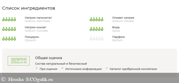 без особых излишеств, как могло бы быть у косметических мыл, но более интересный и полный по омыливаемым маслам в категории хозяйственных (например, чисто кокосовых).