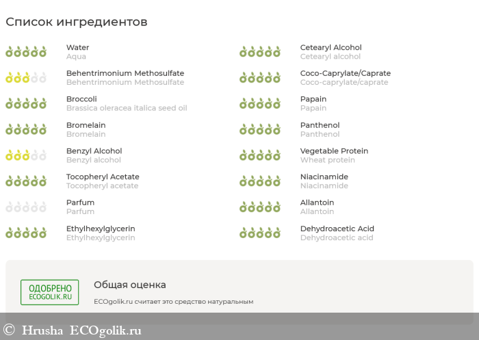 Тут кроме обещанных энзимов видим из кондиционеров-эмолентов - Бегентримония метосульфат, Коко-каприлат/Капрат, Масло брокколи, также увлажняющая и противовоспалительная связка пантенола и аллантоина, ну и очень многозадачный ниацинамид, который и успокаивает, и стимулирует одновременно
