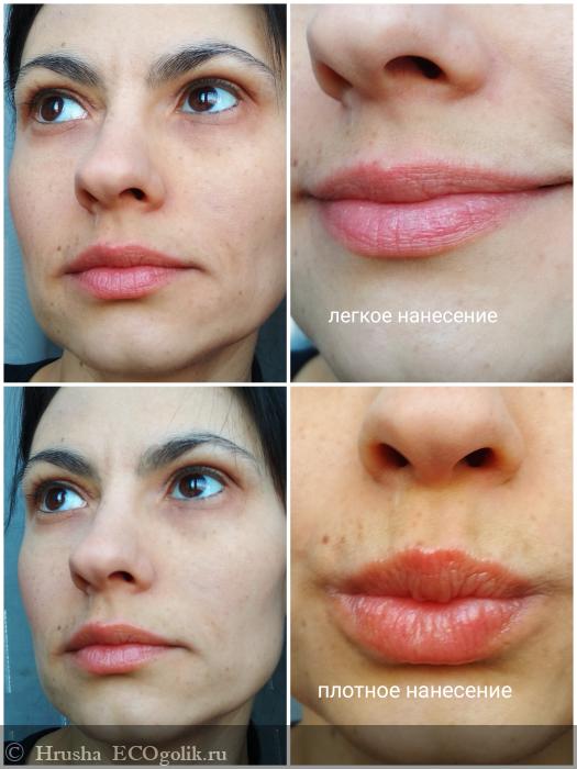 Нанесение очень приятное - не тащится по коже, а гладко ложится любым слоем, какой нужно. Можно и просто припечатать по губам для микро-слоя.