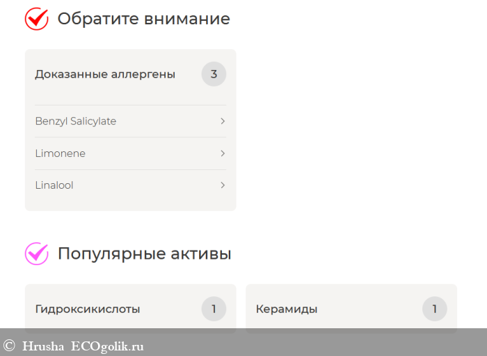 Еще тут есть аллергены - но два из них лимонен и линалоол я вижу и без проверки, на них у меня реально может быть реакция (и была в паре средств европейских брендов - для них это базовые компоненты, часто их вижу у именитых брендов и еще плюс к ним гераниол, но на продукты российских брендов не было).