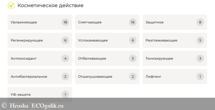 Кроме 18! компонентов (восемнадцать, Карл!), отнесенных к увлажняющим, 16 пунктов - за смягчение, 8 и по 6 - защита, регенерация и успокаивающее действие, ну и так далее - сами видите