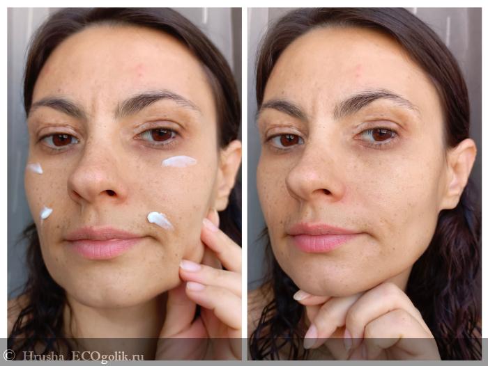 Повторюсь - такой влажный финиш не означал, что кожа "сияет блеском" до вечера - буквально через пару минут кожа подъедала крем и выглядела просто ухоженно - но не наглухо матово.