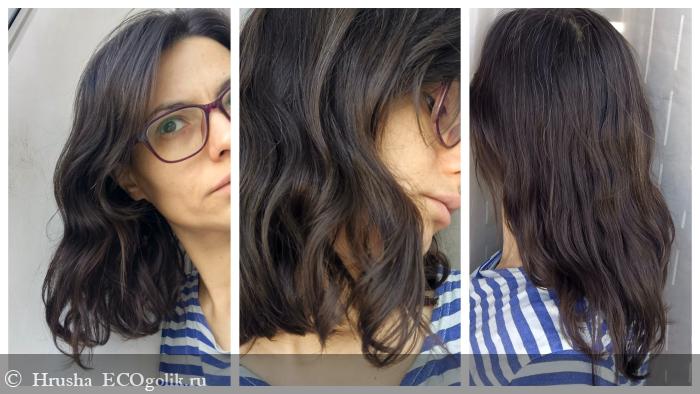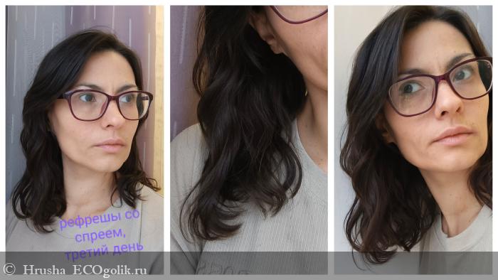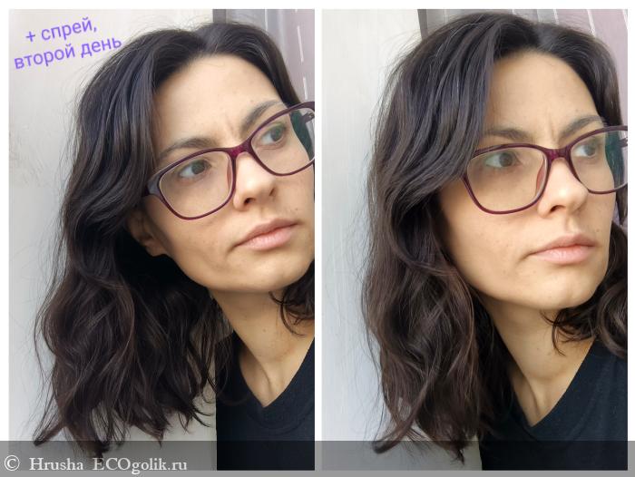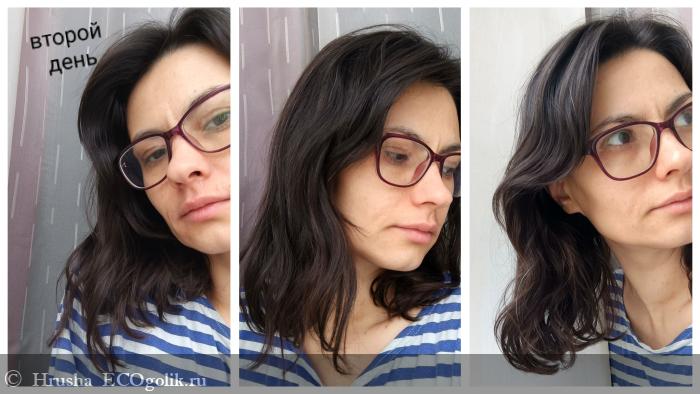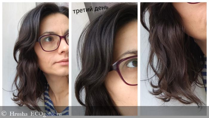 На третий день я только слегка двумя пшиками уже на ладони, а не на волосы, освежила форму локонов - хотя они итак были без пушистости, гладкие и блестящие на солнышке.