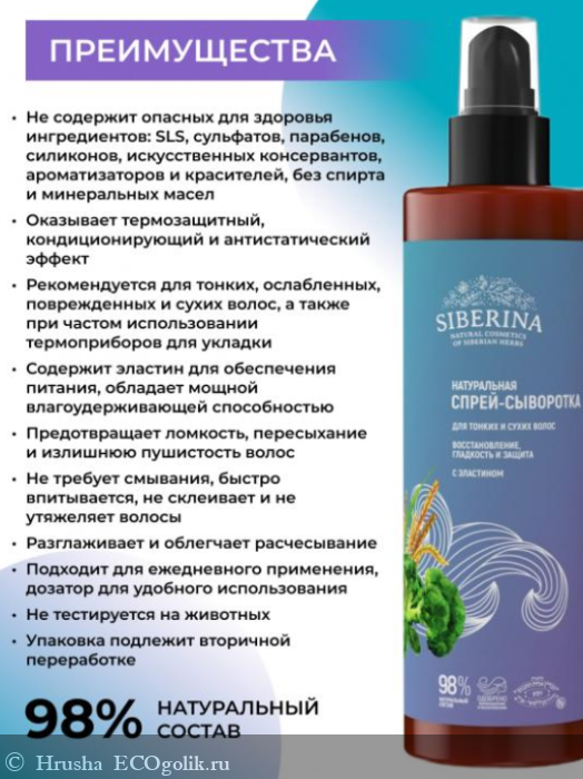 Hrusha: Сыворотка для тонких и сухих волос "Восстановление, гладкость и защита" с эластином от SIBERINA