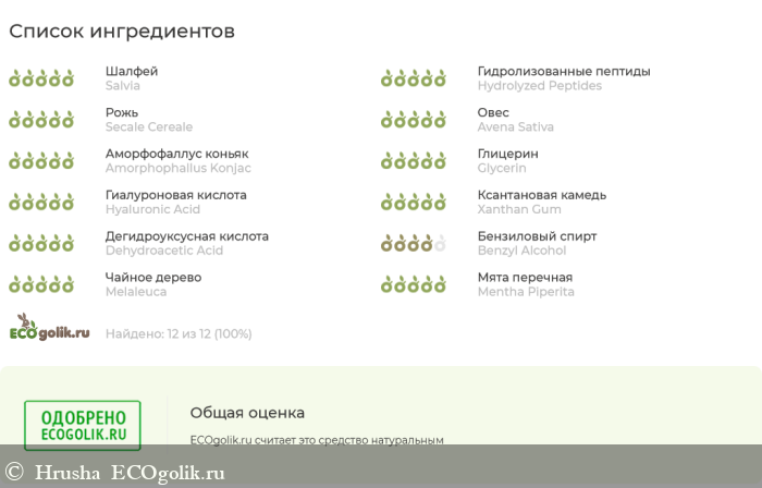 Гидролат шалфея, гидролизованные пептиды пшеницы, ржи и овса, глюкоманнан (полисахарид), глицерин, высокомолекулярная гиалуроновая кислота, ксантановая камедь, дегидроуксусная кислота, бензиловый спирт (растительные консерванты), эфирное масло чайного дерева, эфирное масло мяты.