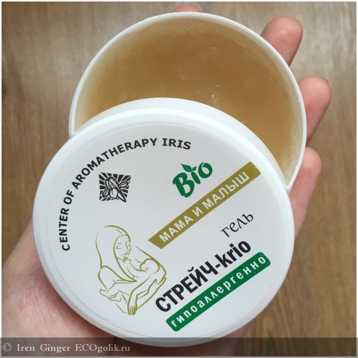 Марку Iris использую примерно 2 года, в принципе довольна. Этот отзыв посвящён гелю "Стрейч-krio", предназначенного для ухода за кожей после родов. Состав: Chamomilla Recutita flower water, Carbomer, Sodium Hydroxide, Aloe vera extract, Mentha piperita essential oil, Anethum graveolens essential oil, Eucalyptus globulus oil, Juniperus communis essential oil, Rosmarinus officinalis essential oil,Chlorophyll.