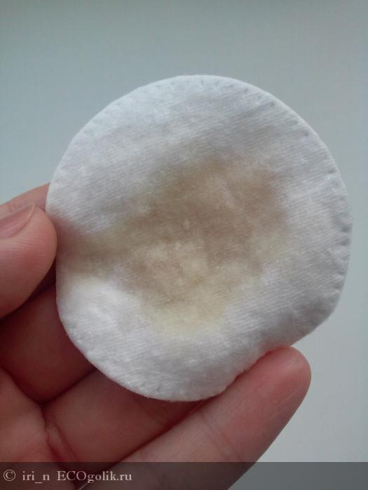 Вот как выглядит этот тонизирующий лосьон на чистом ватном диске. Как видно, цвет - коричневатый.