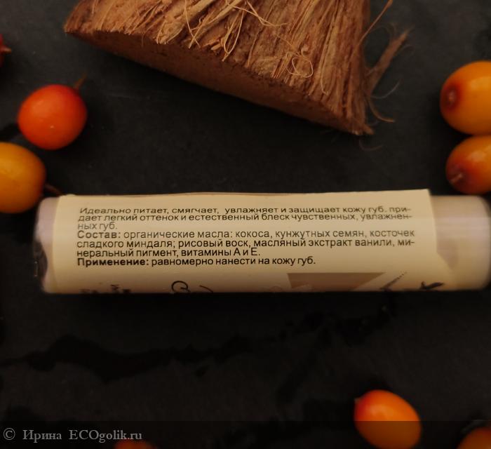 органические масла (кокоса, кунжутных семян, косточек сладкого миндаля), рисовый воск, масляный экстракт ванили, минеральный пигмент, витамины А и Е.