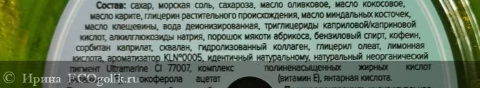 сахар тростниковый, морская соль, сахароза, масло оливковое, масло кокосовое, масло карите, глицерин растительного происхождения, масло миндальных косточек, масло клещевины, вода деионизированная, триглицериды каприловой/каприновой кислот, алкилглюкозиды натрия, порошок мякоти абрикоса, бензиловый спирт, кофеин, сорбитан каприлат, сквалан, гидролизованный коллаген, глицерил олеат, лимонная кислота, пигмент CI 77007, ароматизатор KL№0005 (идентичный натуральному), комплекс полиненасыщенных жирных кислот (витамин F), токоферола ацетат (витамин Е), янтарная кислота