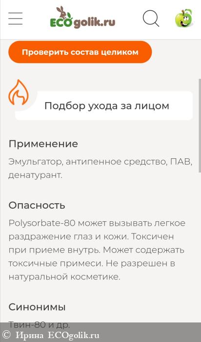 Отмечу, что проверка состава на сайте «ECOgolik» показала опасность компонента «Твин-80».