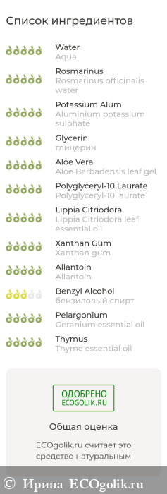 Экоголик оценивает средство как натуральное, большинство компонентов - на "5".
