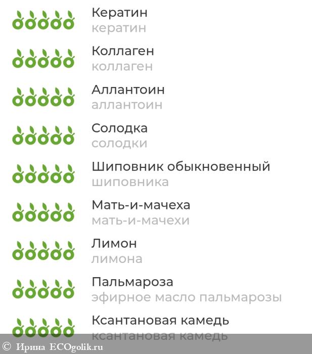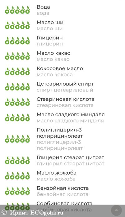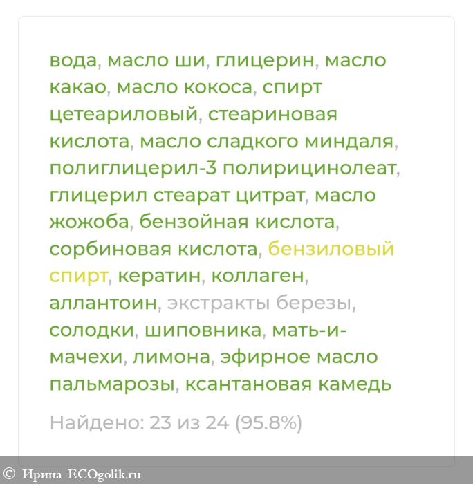 Глицерин — классический увлажнитель, который притягивает влагу в кожу. Растительные масла (ши, какао, кокос, сладкий миндаль, жожоба) смягчают и питают кожу. Радует наличие в составе таких полезных натуральных компонентов, как экстракты березы, солодки, шиповника, мать-и-мачехи, лимона, эфирное масло пальмарозы.