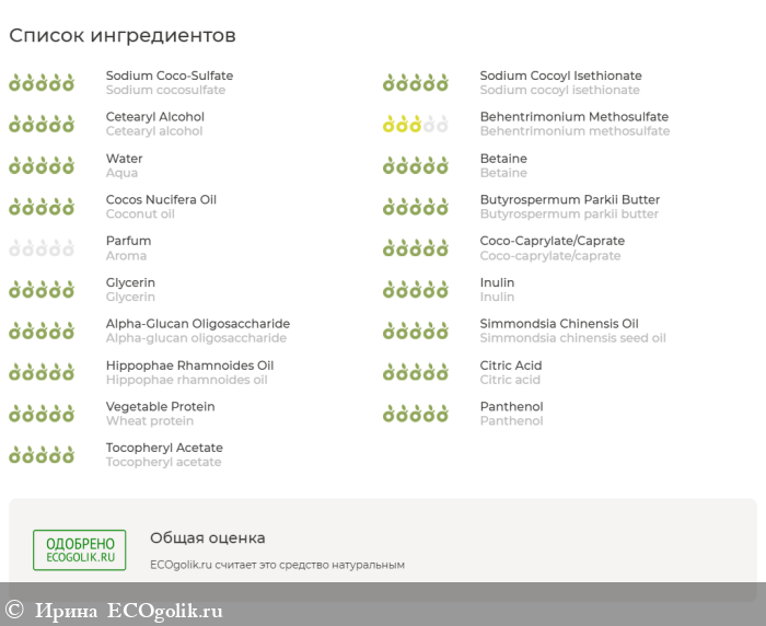 Состав у шампуня очень достойный. Это только натуральные компоненты и всего один "троечный" по шкале от "Экоголика". Мне очень понравилось, что в состав средства входят масла кокоса, ши, жожоба, облепиховое. Думаю, никому не нужно рассказывать, насколько это шикарные продукты для здоровья и красоты волос.