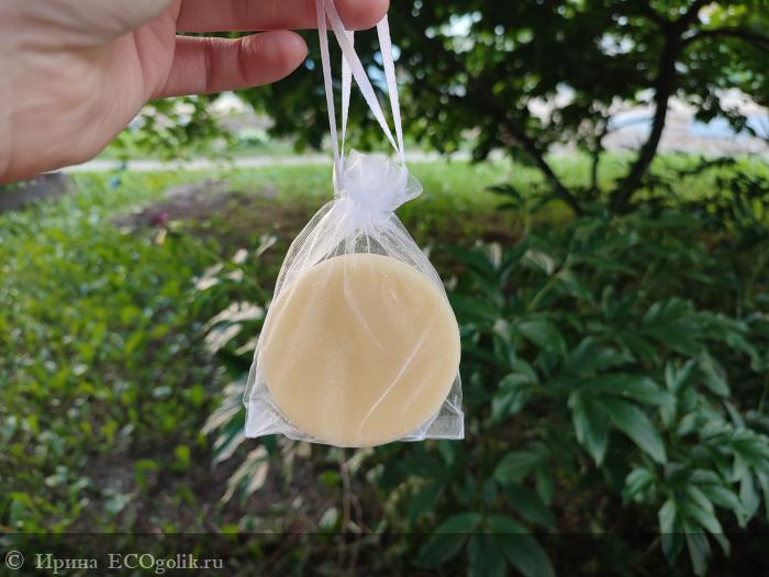На мешочке есть веревочки, за которые после использования шампунь можно повесить в ванной. Мешочек очень тонкий и "дышащий", шампунь в нем быстро просыхает. К тому же я любитель горных походов, в таких местах обычно влажно, шампунь в мыльнице довольно быстро раскисает, а в подобном мешочке всегда можно повесить шампунь на ветке дерева, например, где он будет в целости.
