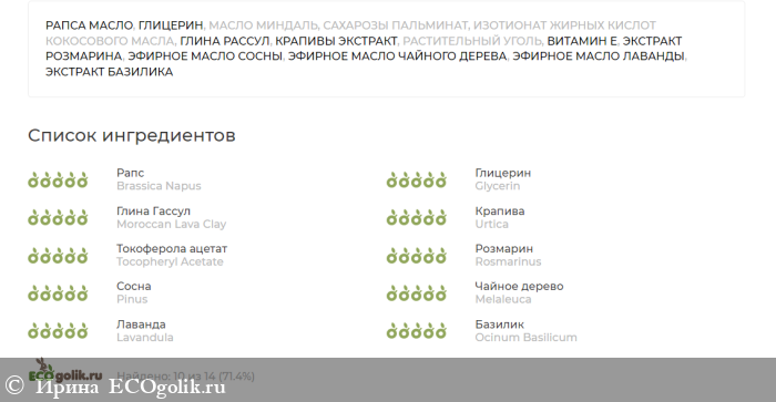 Во время проверки состава средства на сайте "Экоголик" обнаружилось 10 из 14 компонентов, все они получили от портала 5 баллов из 5.
