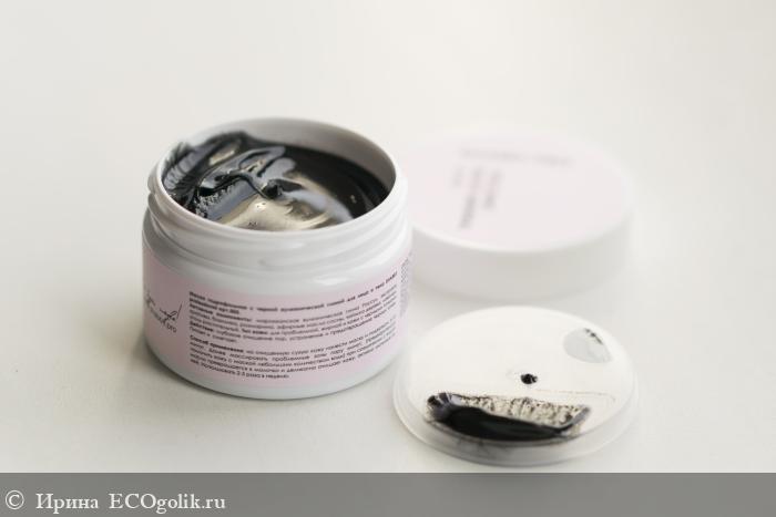 И вот перед нами сама масочка. Она имеет насыщенный черный цвет и консистенцию чуть более жидкую, чем зубная паста. По внутренней крышке понятно, что в банке средство мало растекается, иначе бы при транспортировке она вся была в маске.