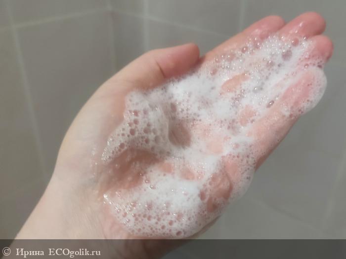 Он хорошо пенится, поэтому того количества, что на ладони, достаточно для того, чтобы на один раз помыть голову.