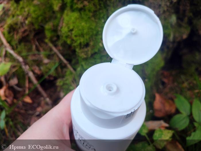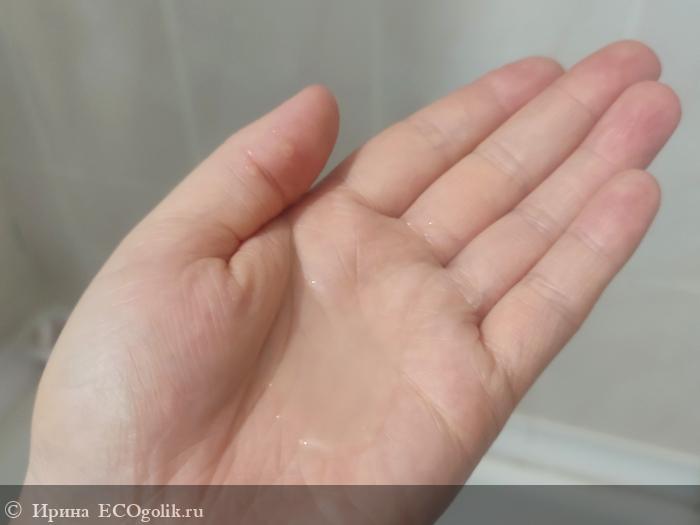Консистенция шампуня довольно густая. Он не очень быстро льется (что неплохо, можно экономичнее использовать), нужно помогать нажатием на стенки бутылочки.