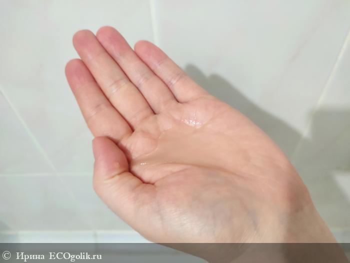 Шампунь имеет жидкую текстуру, он чуть мутноватый.