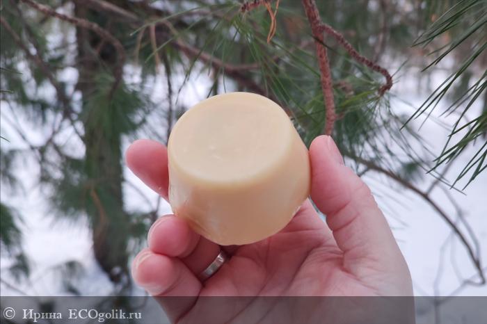 Кондиционер представляет собой твердый брусок весом 50 г. Перед использованием его нужно намочить и растереть между влажными ладонями. Он не дает обильной пены, как шампунь, но на руках образуется плотная, кремовая эмульсия, которая легко распределяется по длине волос.