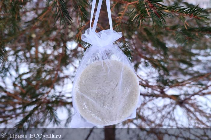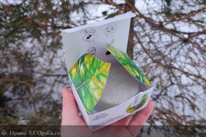 Внутри коробочки находится шампунь в удобном сетчатом мешочке для хранения. Это огромный плюс, так как в нем шампунь хорошо сохнет и не превращается в "кашу" в ванной.