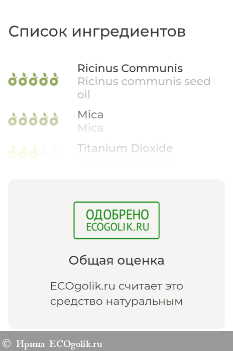 Страшно представить, сколько мы невольно "съедаем" помады за всю свою жизнь. Поэтому я считаю, что у средств для губ должен быть строго натуральный состав. В этом вопросе SIBERINA на высоте. Помада не просто содержит компоненты, полезные для кожи губ (витамин Е, пчелиный воск и воск авокадо, касторовое масло - составляющие, помогающие поддерживать красоту губ, смягчающие, увлажняющие, питающие), она в целом состоит только из натуральных продуктов.