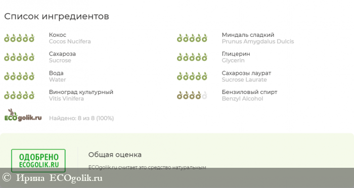 Cocos Nucifera Fruit Powder (стружка кокосовая), Prunus Amygdalus Dulcis Oil (масло миндальное), Sucrose (сахар тростниковый), Glycerin (and) Aqua (and) Sucrose Laurate (гидрофильный компонент), Vitis Vinifera Seed Oil (масло виноградной косточки), Benzyl Alcohol (бензиловый спирт).