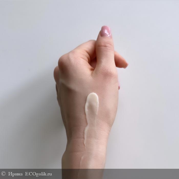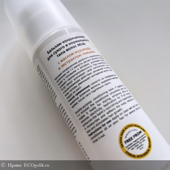 Бальзам имеет плотную кремовую текстуру, очень легко распределяется по влажным волосам. Легко смывается, не утяжеляет волос. Даже если нанести средство на кожу, оно прекрасно впитывается и хорошо разглаживает, не липкий. Хотя всегда когда я фотографирую текстуру средств для волос на коже, потом хочется смыть. А этот бальзам даже так приятно смягчил и успокоил раздраженную кожу! Ароматы средств Sativa нельзя сравнить ни с одним брендом. Их ароматы между собой все немного схожи. Данный бальзам имеет очень легкий, нежный, травяной аромат, с нотками масел макадамии и муру-муру. Расход. На мою длину волос достаточно 2-3 нажатий дозатора.