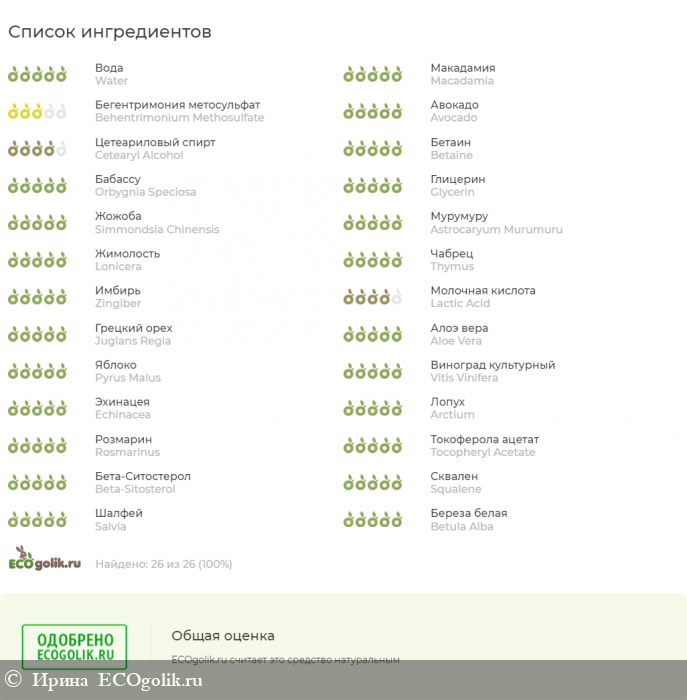 Вода, масло макадамии, бегентримониум метосульфат, масло авокадо, цетеариловый спирт, бетаин, масло бабассу, глицерин, масло жожоба, масло мурумуру, экстракт жимолости, экстракт тимьяна, экстракт имбиря, молочная кислота, экстракт листьев грецкого ореха, экстракт алое вера, экстракт яблок, экстракт виноградных косточек, экстракт эхинацеи пурпурной, экстракт корня лопуха, экстракт розмарина, комплекс токоферолов, бета-ситостерол, сквален, экстракт побегов шалфея, бетулиносодержащий экстракт бересты.