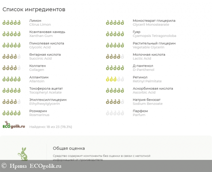 Состав: деионизированная вода с экстрактом лайма, экстрактом мяты, экстрактом лимона, экстрактом манго, глицерин моностеарат, ксантановая камедь, гуаровая камедь, гликолевая кислота, глицерин растительный, янтарная кислота, молочная кислота, гидролизованный коллаген, гидролизованный эластин, провитамин В5, высоко-и низкомолекулярная гиалуроновая кислота, аллантоин, витамин А, витамин Е, витамин С, этилгексил глицерин, бензоат натрия, экстракт розмарина, ароматическое масло.