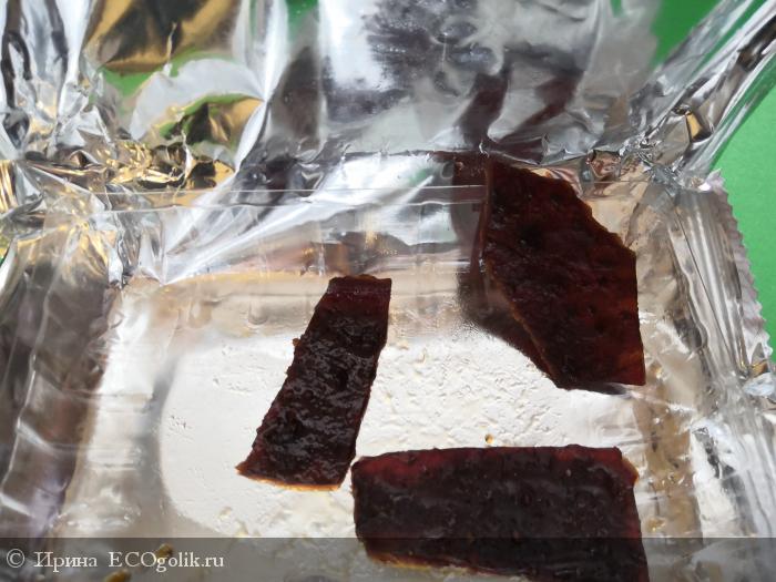 Упаковка сладости достаточно лаконичная. Сама пастила представляет собой небольшую свернутую ленту и лежит в небольшой ванночке. На фото сладость уже нарезана кусочками, чтобы было проще угощать детей. Если присмотреться, то можно увидеть частицы ягод