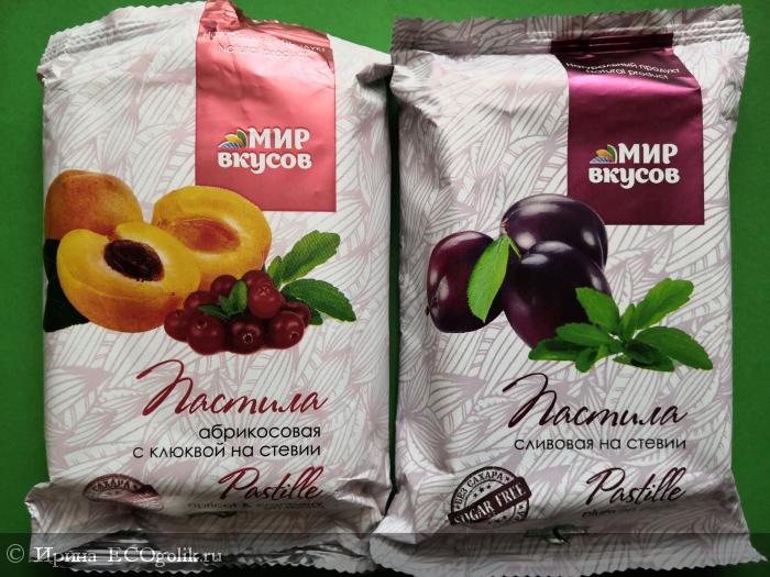 В нашем городе есть интересный магазин здорового питания. Однажды в нем я увидела интересную новинку - пастила на стевии "Мир вкусов". Поскольку мои дочки любят сладкое, то я решила взять пару штук на пробу: сливовую и абрикосовую с клюквой.