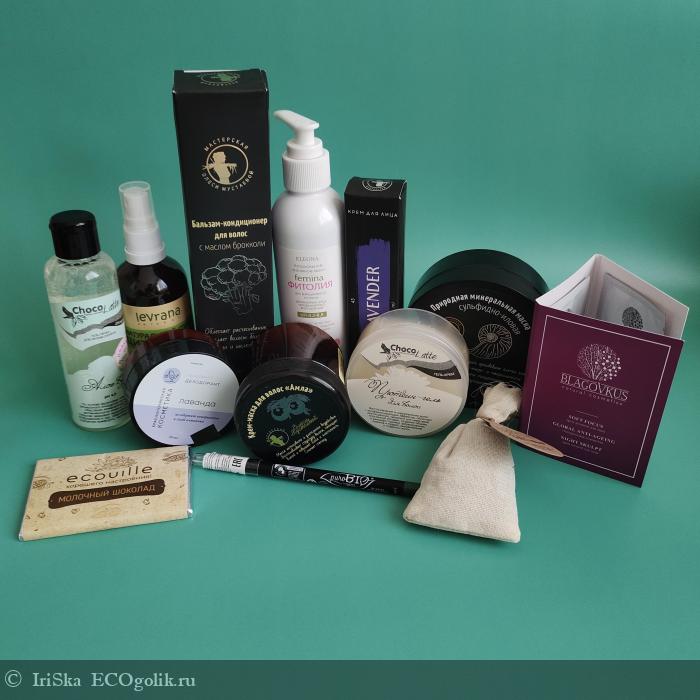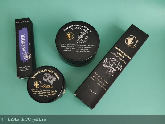 В посылке преобладают средства от Мастерской Олеси Мустаевой. Я пробовала несколько продуктов этой марки, и пока не могу разделить всеобщего восторга от бренда. Поэтому решила дать ему ещё один шанс. Тем более, во время заказа этот бренд участвовал в акции и на него была скидка 20%, которая суммировалась со скидкой от Экоголика, поэтому получилось очень выгодно