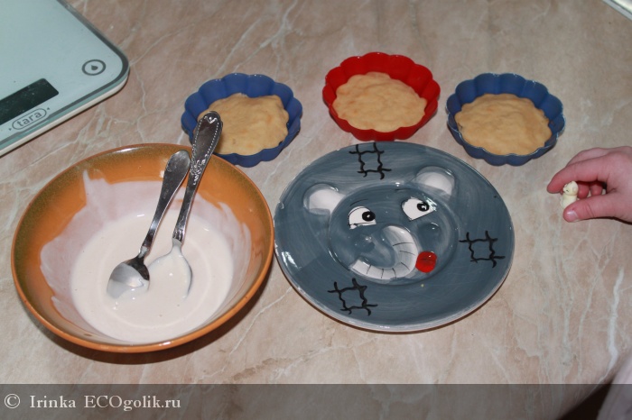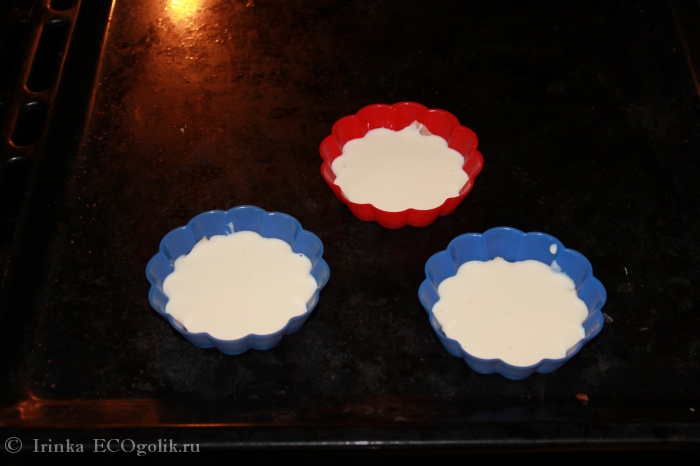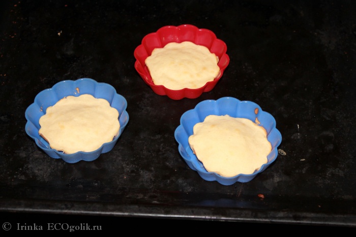 Тесто не должно быть слишком густым. Этого количества теста нам хватит на 3 коржика. Выпекали в силиконовых формах диаметром 6 см.