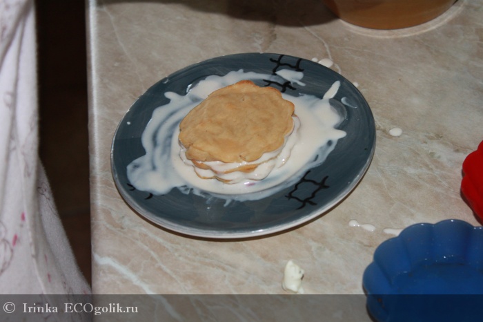Готовность проверяем зубочисткой: протыкаем корж зубочисткой, вытаскиваем ее, и если она сухая – то корж готов, можно доставать. Коржики получаются румяные.