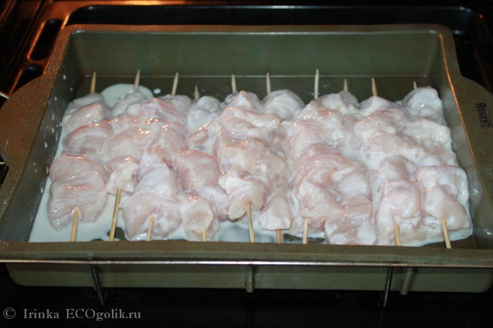 Выкладываем в форму, в которой будем запекать. У меня из этого количества грудок цыпленка получилось 10 шпажек.
