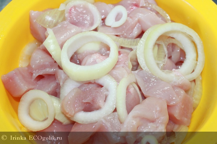 5. Когда грудки замариновались, и пришло время их готовить, нанизываем их на шпажки. Если любите лук, то его тоже можно добавить, но у меня в семье есть привереда, который будет потом ковырять этот лук из тарелки, так что я оставлю его в маринаде