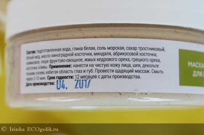 Состав: подготовленная вода, глина белая, соль морская, сахар тростниковый, белый мед, масла: виноградной косточки, миндаля, абрикосовой косточки, оливковое, пюре фруктово-овощное, жмых кедрового ореха, грецкого ореха, косточка оливы, коллоидное серебро.