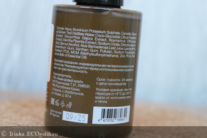 С составом можно ознакомиться с обратной стороны флакона. Дезодорант не содержит хлоридов алюминия, синтетических отдушек, спирта. Аромат - натуральный, приятный, хорошо улавливается мята, которая сглаживается нотками растительных, легких ноток