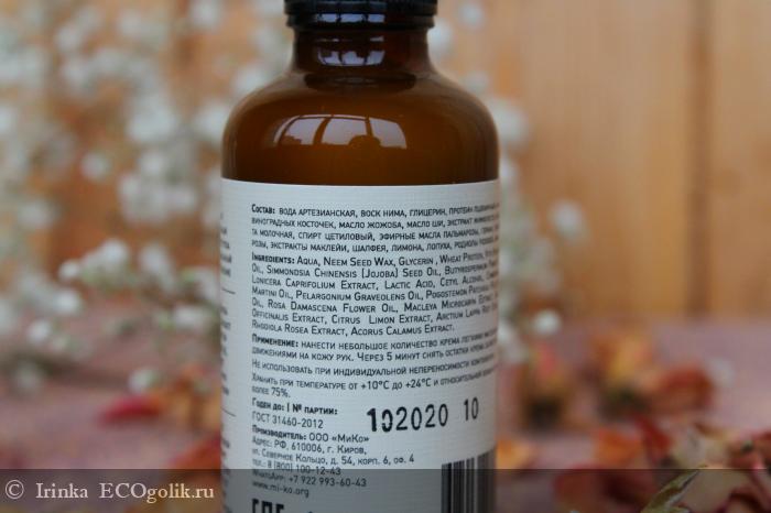 В него входит вода артезианская, гидролат розы дамасской*, воск нима, миндаля сладкого масло рафинированное*, глицерин**, сквалан, масло виноградных косточек*, трегалоза, масло жожоба*, натуральная парфюмерная композиция, масло ши*, эфирное масло пальмарозы*, экстракт шалфея, эфирное масло герани*, кислота анисовая, экстракт аира, экстракт корня лопуха, экстракт родиолы розовой, экстракт розы дамасской, кислота молочная, эфирное масло пачули*, эфирное масло розы дамасской*