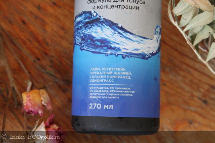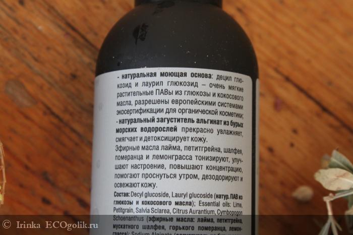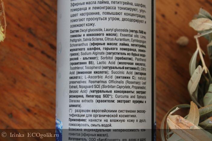 В состав геля входит aqua; Decyl glucoside, Lauryl glucoside (натур. ПАВ из глюкозы и кокосового масла); Essential oils: Lime, Petitgrain, Salvia Sclarea, Citrus Aurantium, Cymbopogon Schoenanthus (эфирные масла: лайма, петитгрейна, мускатного шалфея, горького померанца, лемонграсса); Sodium Alginate (загуститель из бурых водорослей - альгинат); Sorbitol (пребиотик), Panthenol (провитамин В5), Lactic Acid (молочная кислота), Tocotrienol, Tocopherol (натуральный витамин Е); Citric Acid (лимонная кислота); Succinic Acid (янтарная кислота); L-Ascorbic Acid (витамин С); natural preservatives: Rosmarinus Officinalis (Rosemary) Leaf Extract, Nipaguard SCE (Sorbitan Caprylate, Propanediol, Benzoic Acid) (натуральные консерванты: экстракт розмарина, Нипагард SCE*); Curcuma and Spinacia Oleracea extracts (красители: экстракты куркумы и шпината).