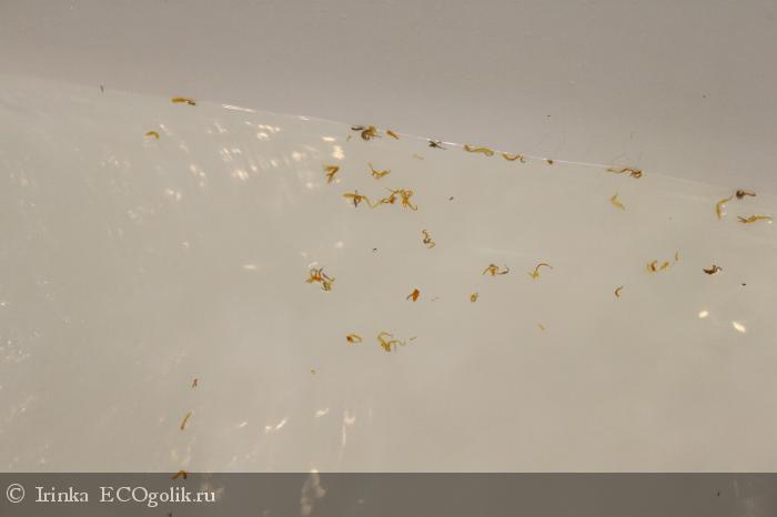 Внутри спрятаны лепестки календулы, которые расплываются по ванне.