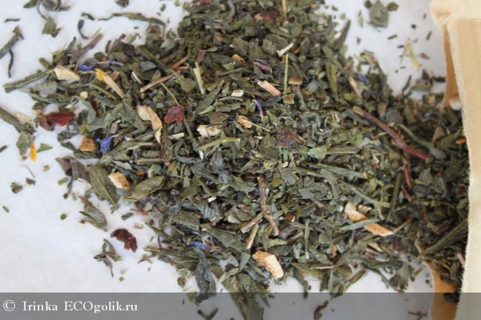В его состав входит: зеленый чай, апельсиновая цедра, мелиса, мята, василек, шиповник.