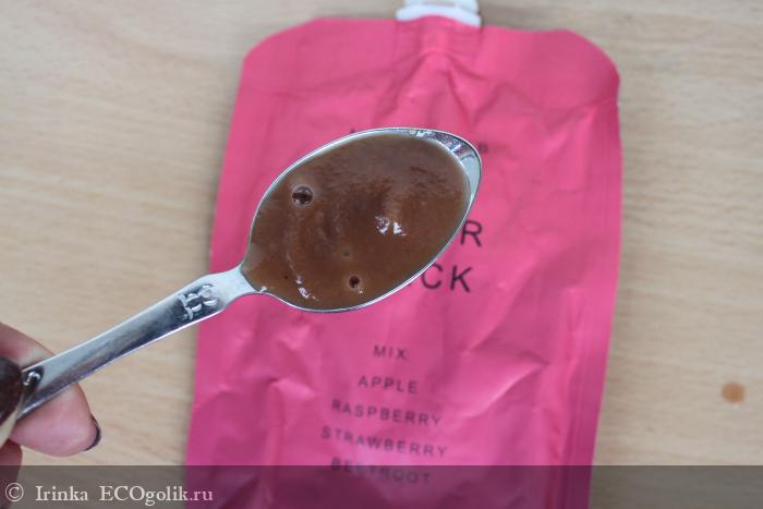 Здесь в составе 71% пюре яблока (из концентрированного фруктового пюре), пюре малины 12% (из концентрированного фруктового пюре), пюре клубники 10%, пюре свеклы 7%.