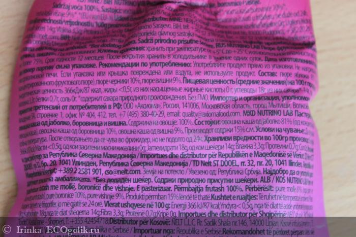 Вся необходимая информация представлена с обратной стороны упаковки. На 100 г продукта приходится 87 ккал. 81% составляет пюре яблока (из концентрированного фруктового пюре), 10% приходится на пбре черники и 9% - на пюре вишни.
