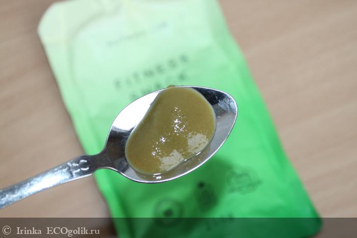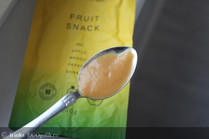 И на 100 г продукта приходится всего 70 ккал. То есть в упаковке содержится 140 ккал. Во вкусе преобладает яблоко, затем я хорошо чувствую банан, и следом ощущается тропический вкус манго и папайи.