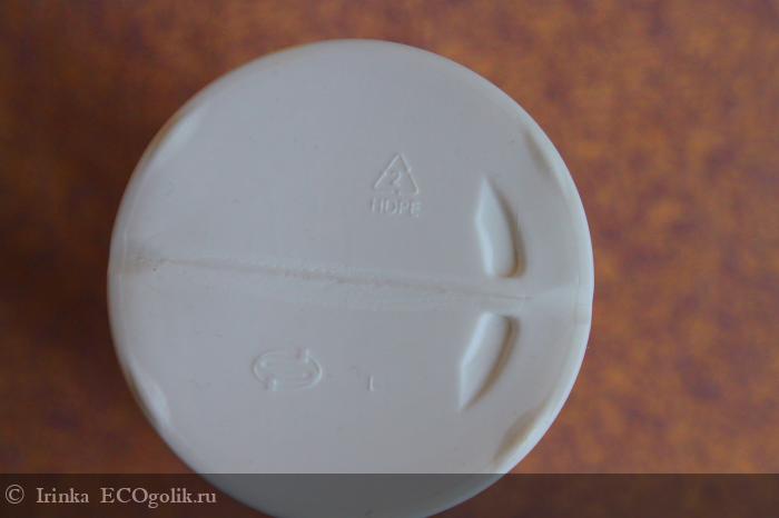 Бутылка выполнена из перерабатываемого пластика. Имеет маркировку 2 HDPE.