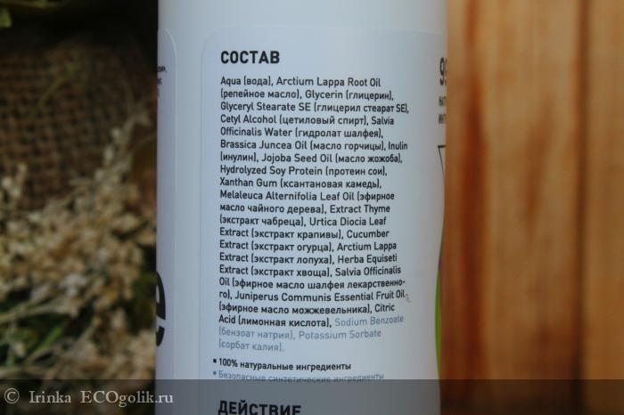 В него входит вода, репейное масло, глицерин, глицерил стеарат SE, цетиловый спирт, гидролат шалфея, масло горчицы, инулин, масло жожоба, протеин сои, ксантановая камедь, эфирное масло чайного дерева, экстракт чабреца, экстракт крапивы, экстракт огурца, экстракт лопуха, экстракт хвоща, эфирное масло шалфея лекарственного, эфирное масло можжевельника, лимонная кислота, бензоат натрия, сорбат калия.
